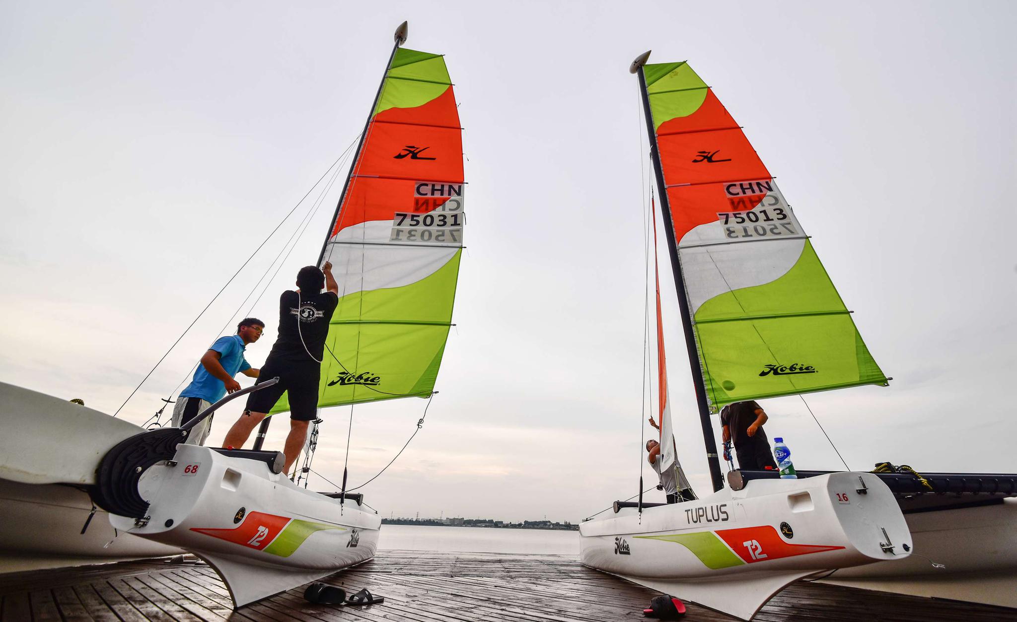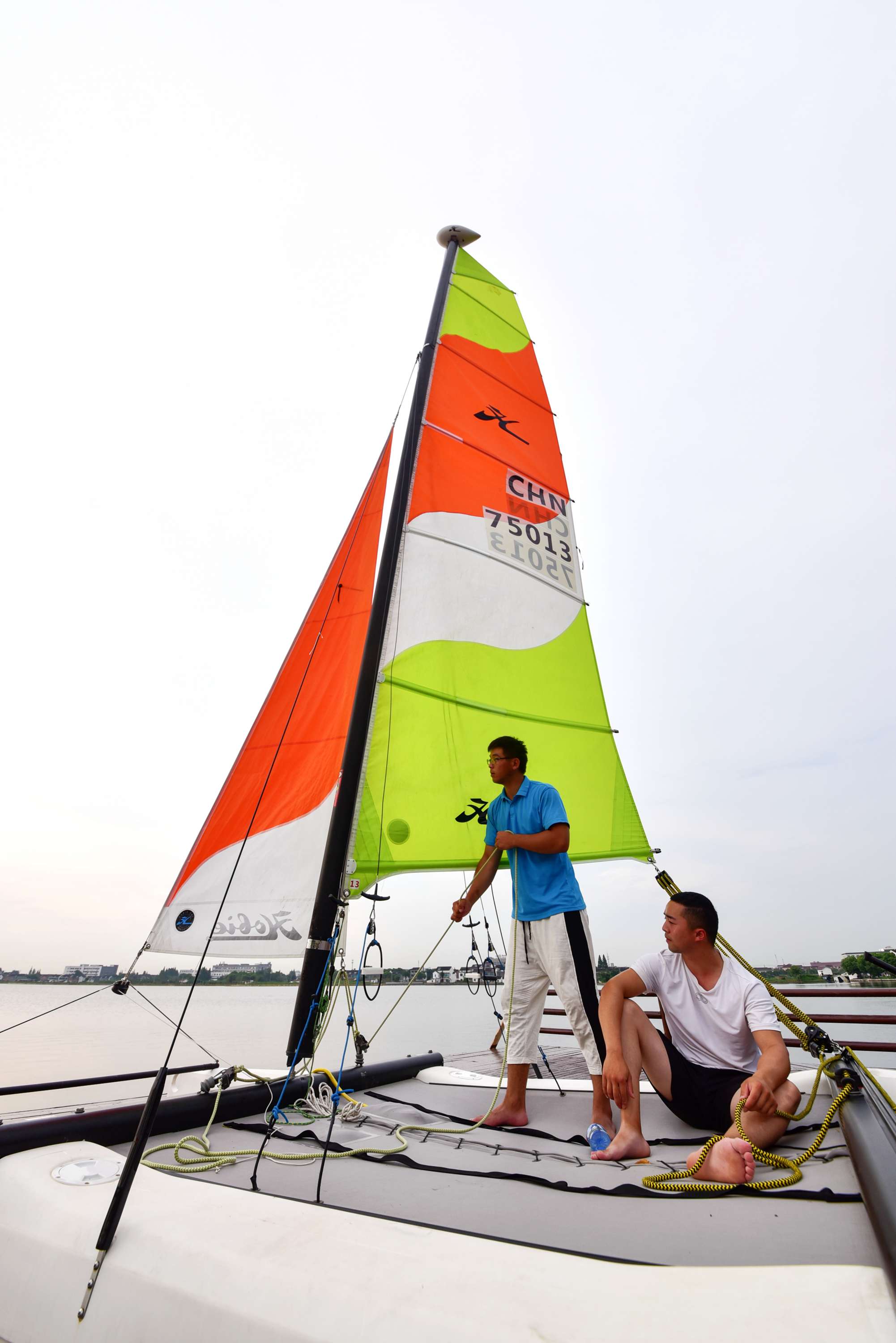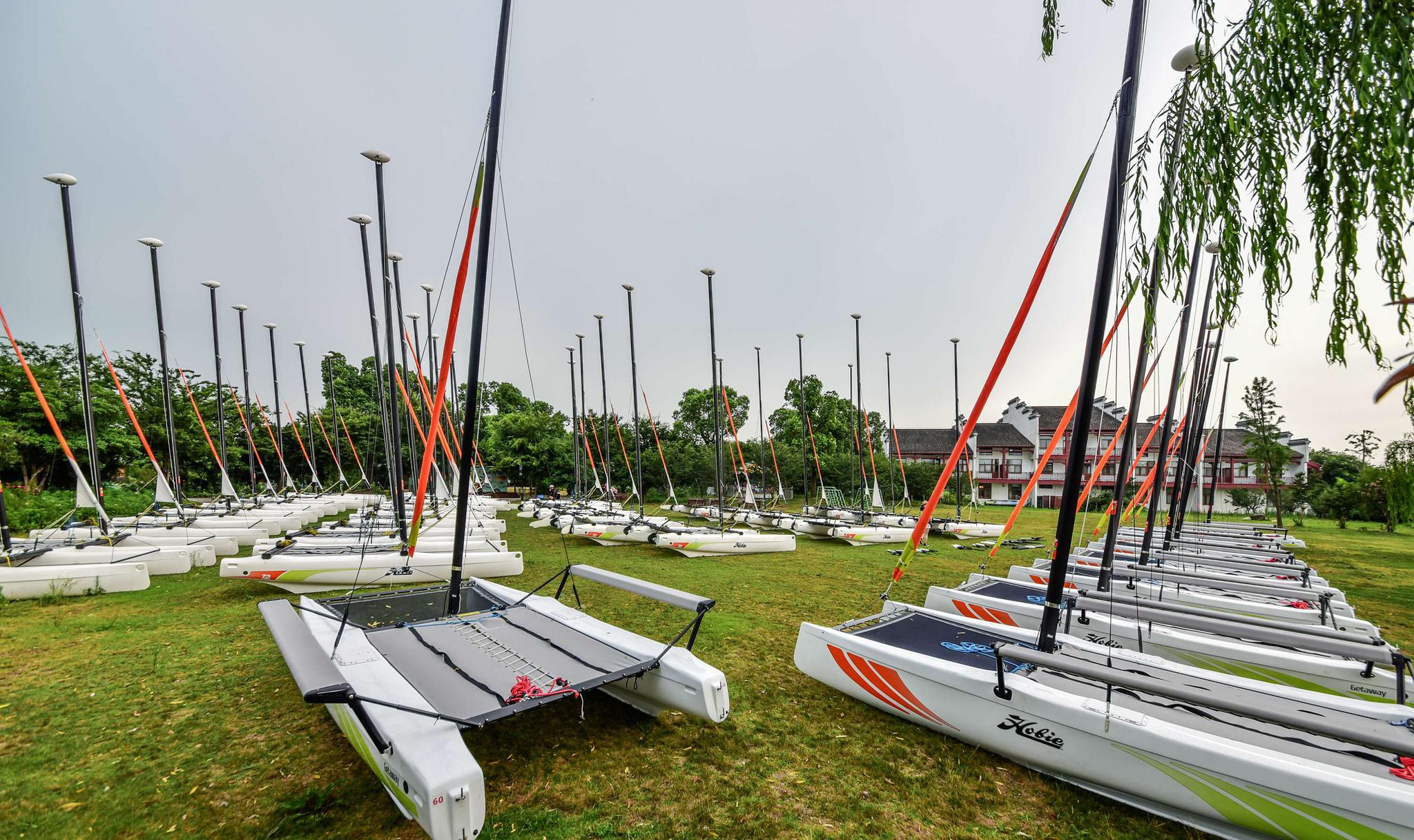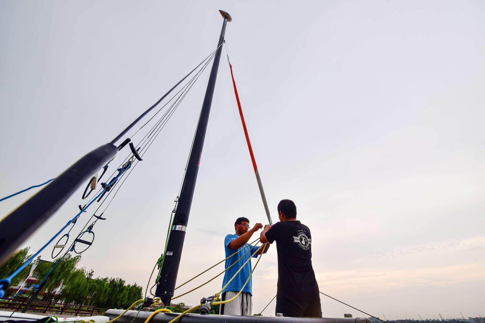 无锡鹅湖玫瑰园里的全国青少年帆船比赛,正在最后的安装调试中。