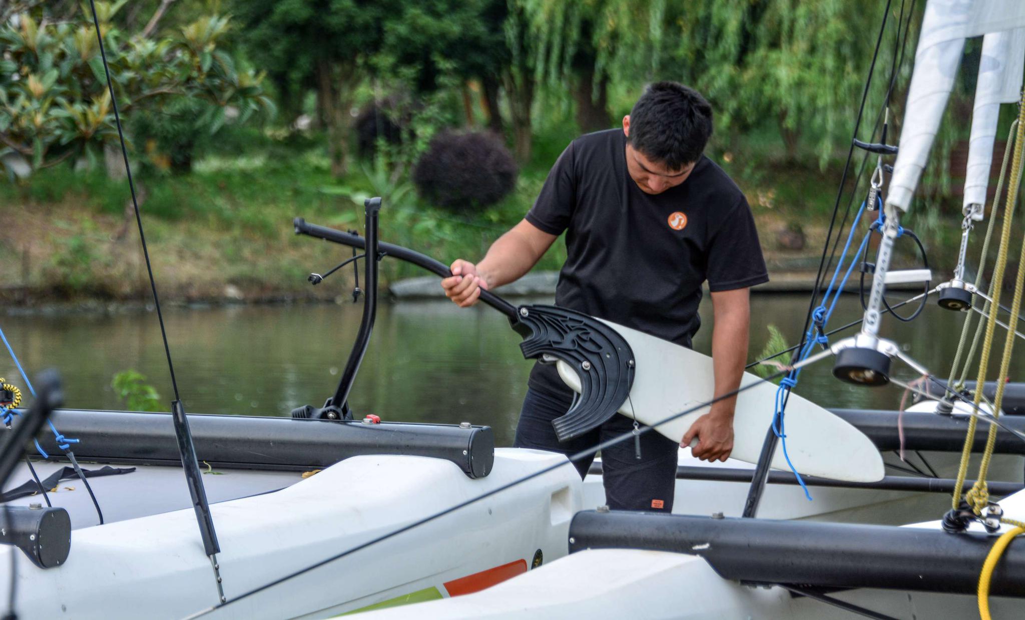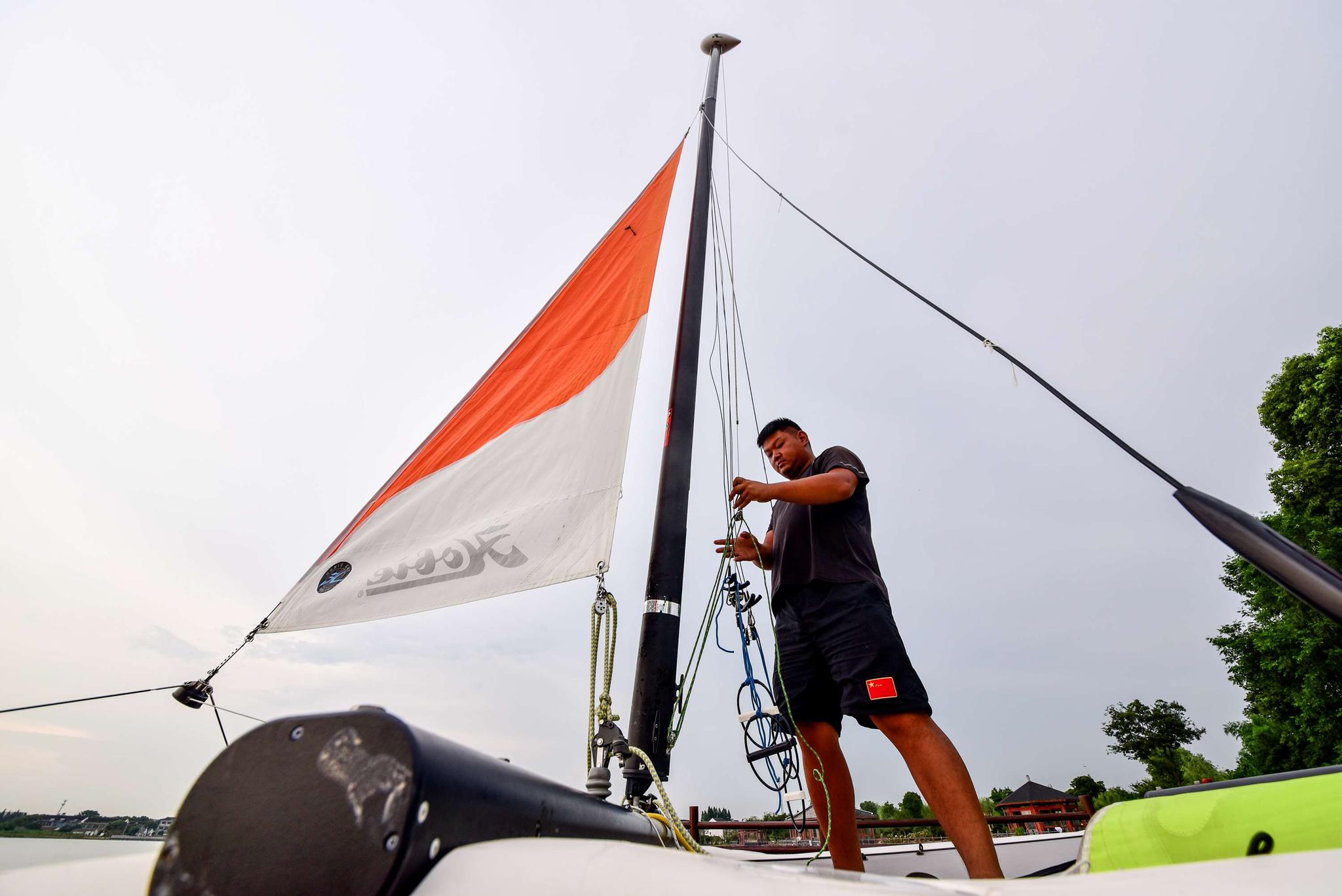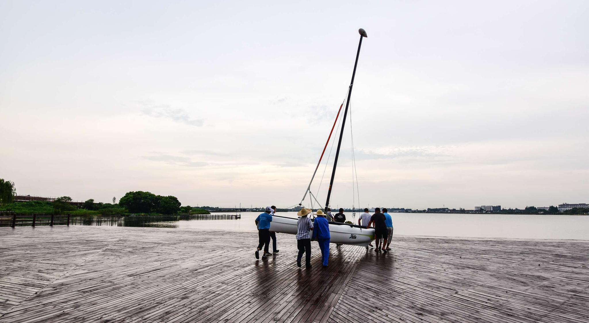 无锡鹅湖玫瑰园里的全国青少年帆船比赛,正在最后的安装调试中。