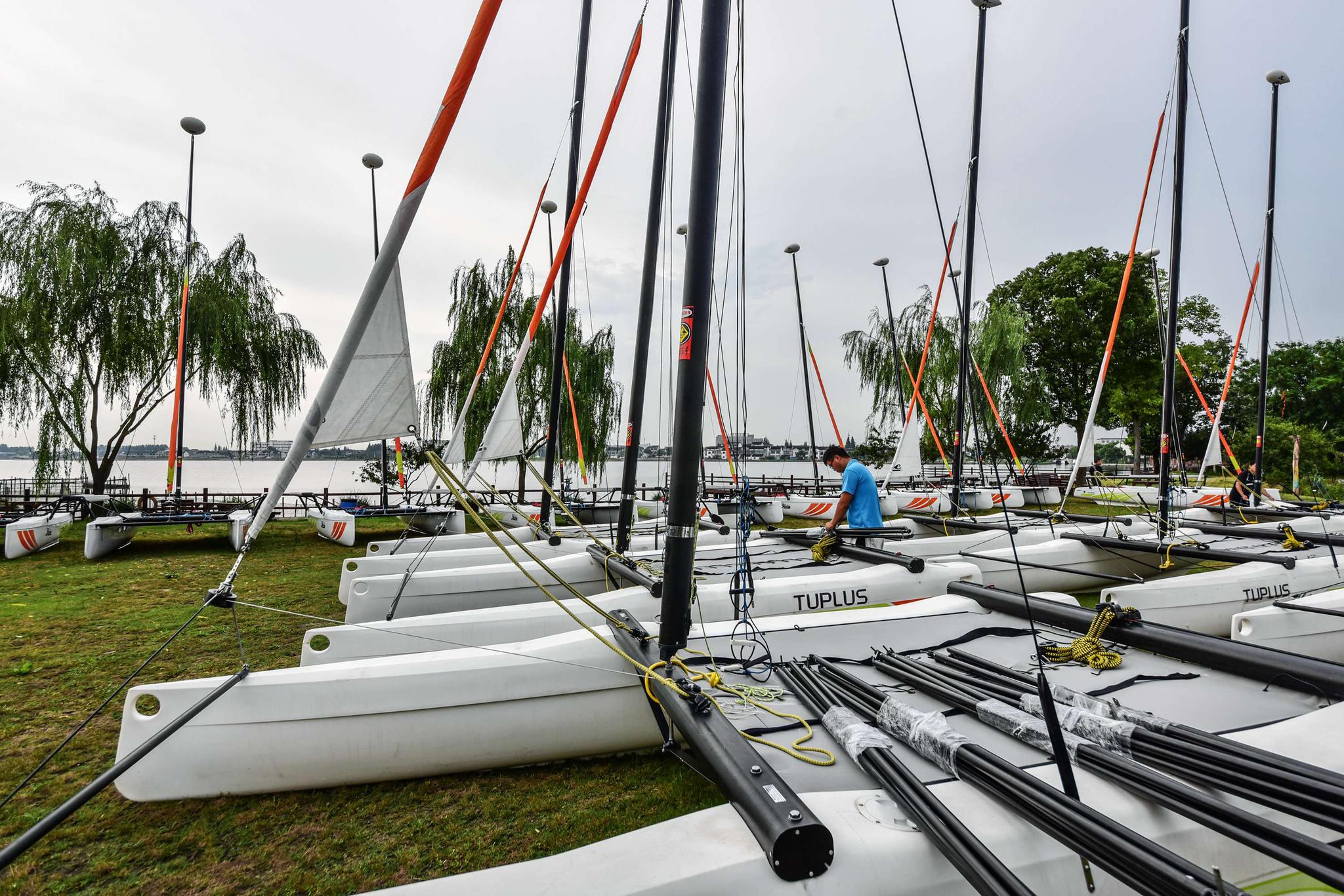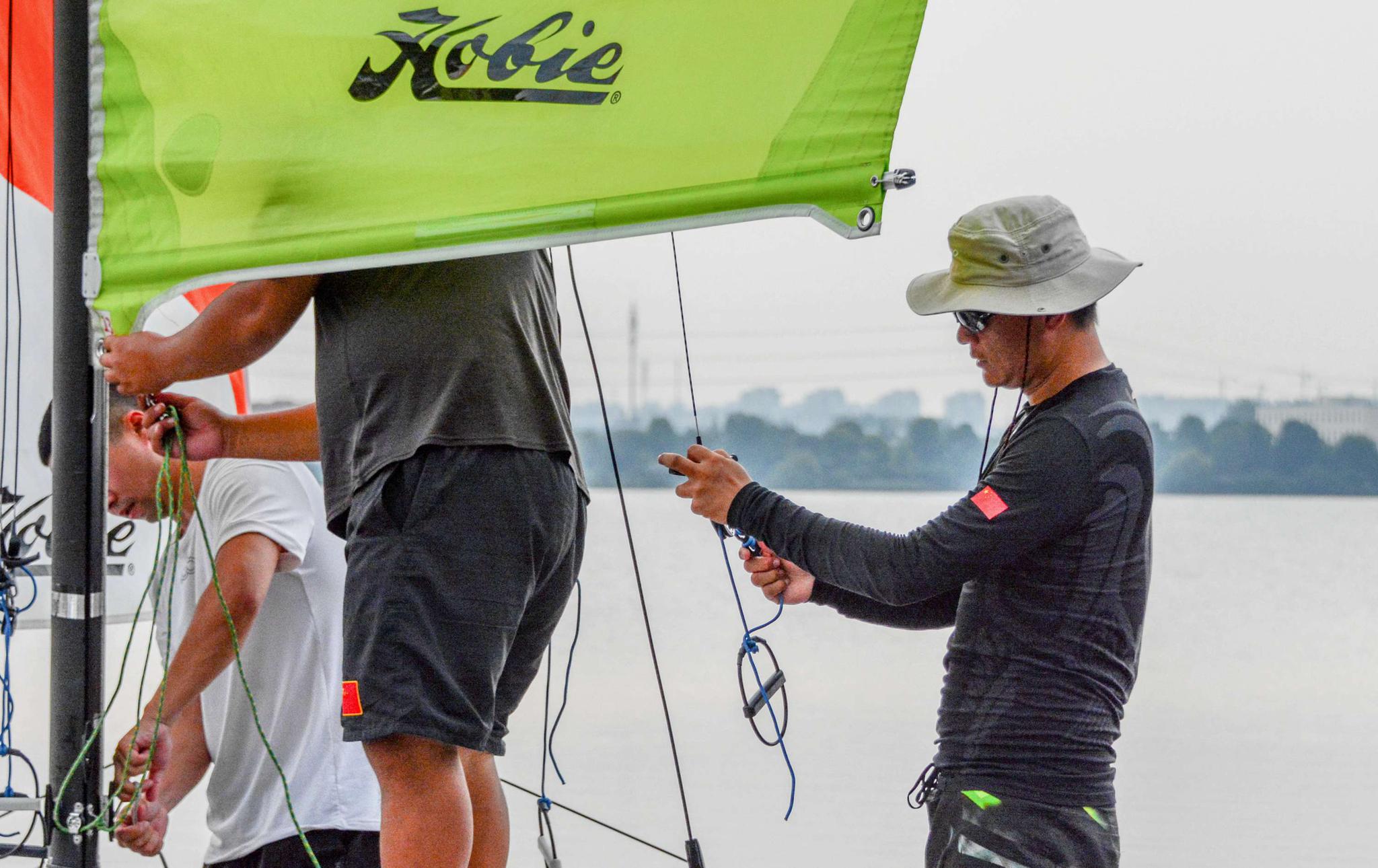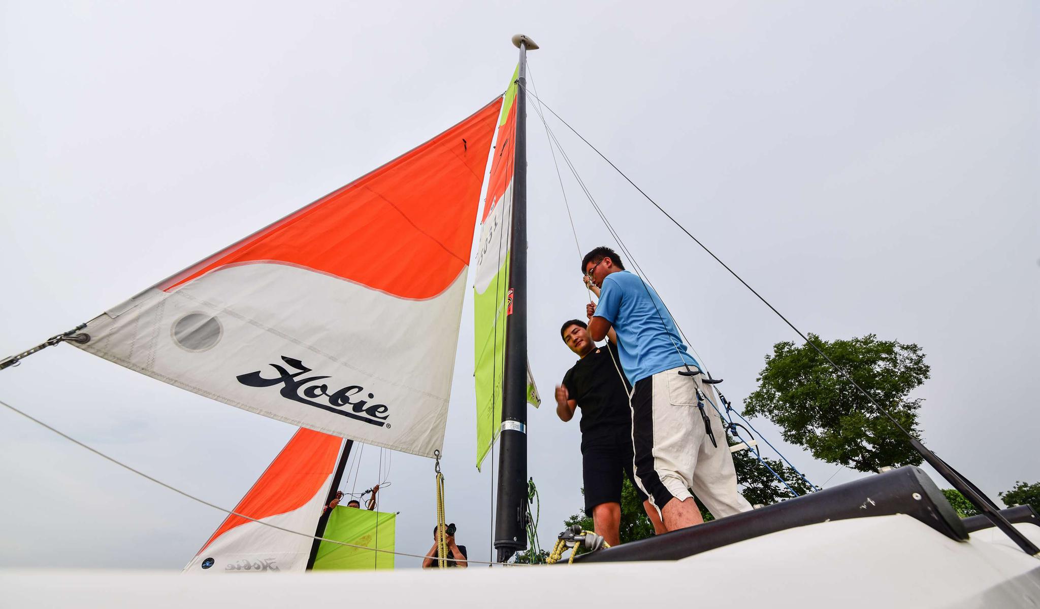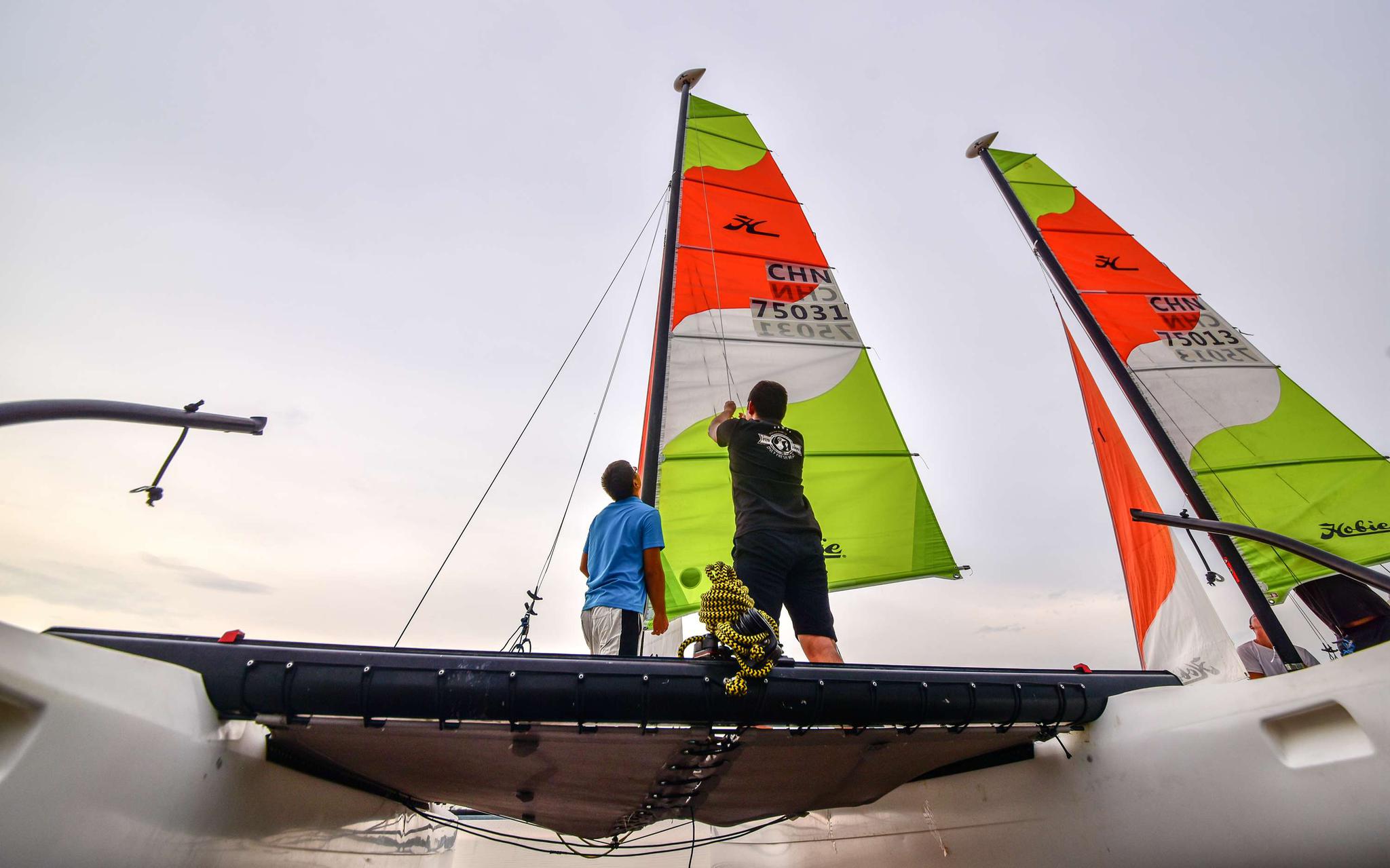 无锡鹅湖玫瑰园里的全国青少年帆船比赛,正在最后的安装调试中。