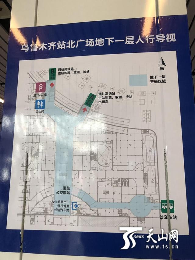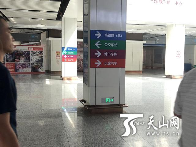 8月20日,记者在乌鲁木齐站正对出站口处,看到一块悬挂在空中的LED大屏,上面标注着旅客搭乘出租车、长途汽车、公交车该前往的方向,而出站口两侧则竖立摆放着“公交线路图”。记者乘坐扶梯进入地下一层,在大厅内的立柱上、地面上都可以看到指引标识。
