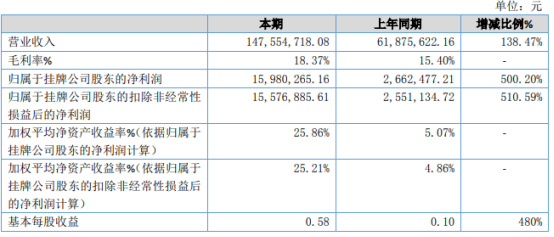 挖贝网4月18日,宇宏新科(832105)近日发布2020年度报告,报告期内公司实现营业收入147,554,718.08元,同比增长138.47%;归属于挂牌公司股东的净利润15,980,265.16元,同比增长500.20%。