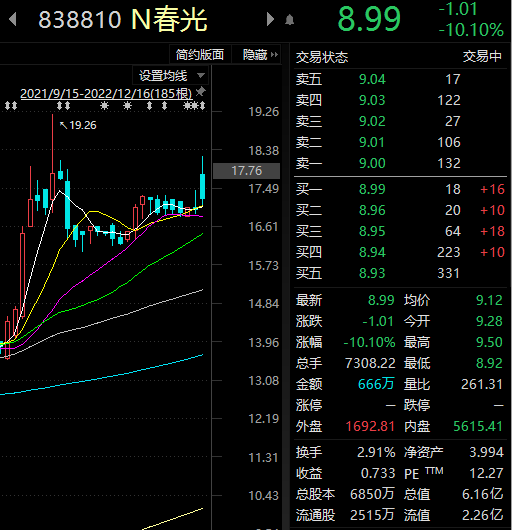 挖贝网12月16日消息,春光药装(838810.BJ)、丰安股份(870508.BJ)双双破发。截止发稿时间,春光药装报收8.99元/股,较发行价下跌10.10%;?丰安股份报收8.88元/股,较发行价下跌11.20%。