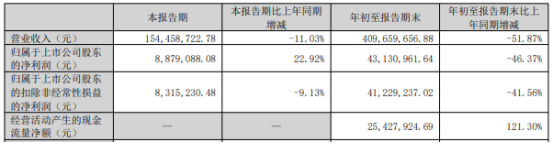 挖贝网10月24日,海波重科(300517)(300517)发布2022年三季度报告,公告显示,2022年前三季度营业收入为409,659,656.88元,比上年同期下滑51.87%;归属于上市公司股东的净利润为43,130,961.64元,比上年同期下滑46.37%。