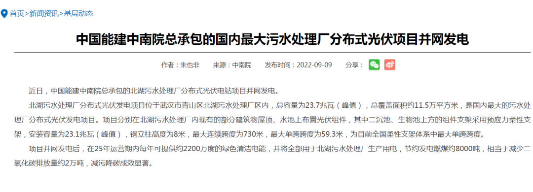 武汉控股下属北湖污水处理厂与中国电力工程顾问集团中南电力设计院有限公司共同合作开展分布式光伏电站项目,预计总装机容量为23.73MW。