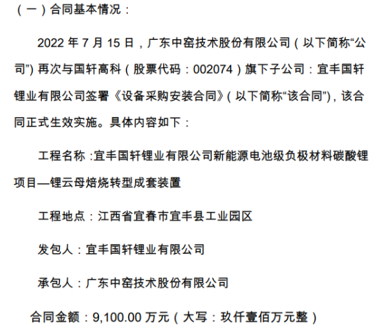 挖贝网7月29日,中窑技术(830949)发公告称,2022年7月15日,广东中窑技术股份有限公司(以下简称“公司”)再次与国轩高科(002074)(股票代码:002074)旗下子公司:宜丰国轩锂业有限公司签署《设备采购安装合同》(以下简称“该合同”),该合同正式生效实施。具体内容如下: