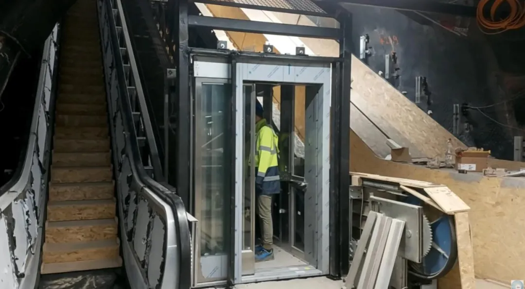 然而,设计师面临一个问题,因为车站相对较小,并且没有考虑到未来的任何类型的电梯,他们必须想出一个解决方案,以便能够将倾斜的电梯安装到自动扶梯井中。